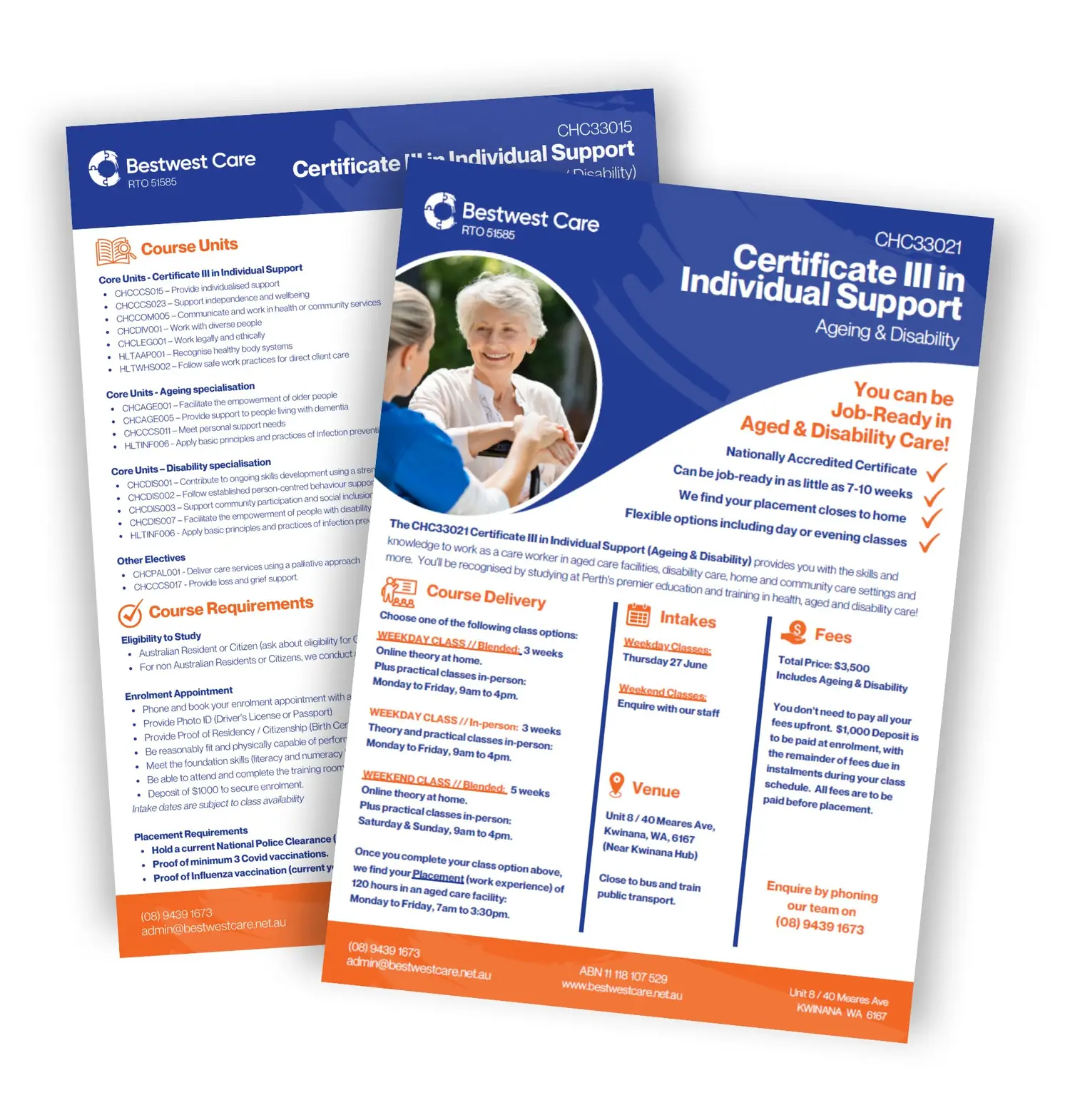 Bestwest Care offers flexible learning options including full-time, part-time and evening classes and can customise schedules to suit your life experience and individual study needs. If full-time study is undertaken, the course duration is 7-10 weeks. This is dependent on learner progress and is reliant on students meeting all criteria before receiving their certificate.